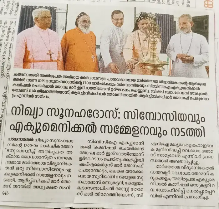 ചങ്ങനാശേരി: നിഖ്യാ സൂനഹദോസിന്റെ 1700-ാം വാർഷികത്തോടനുബന്ധിച്ച് അതിരൂപത അല്മായ ദൈവശാസ്ത്ര പഠനകേന്ദ്രമായ മാർത്തോമ വിദ്യാനികേ തൻ ഒരു സിമ്പോസിയവും എ ക്കുമെനിക്കൽ സമ്മേളനവും നടത്തി. ആർച്ച്ബിഷപ് മാർ തോമസ് തറയിൽ അധ്യക്ഷത വഹിച്ചു.
